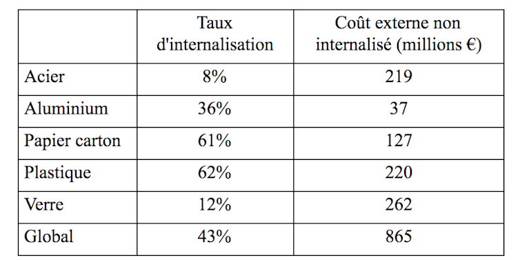 Dans une étude récente, nous avons cherché à estimer si ces taux étaient fixés au bon niveau. Le critère choisi pour cette évaluation est issu de la théorie économique de l’internalisation des coûts externes. Celle-ci prédit que le conditionneur prendra une décision optimale du point de vue de l’intérêt général si le niveau de l’écocontribution par emballage est égal à son coût externe. C’est-à-dire à la somme du coût économique de son traitement en fin de vie et des coûts environnementaux qu’il génère.