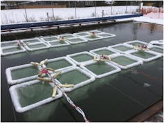 Des changements de l’albédo des eaux glaciaires auraient de graves conséquences sur le cycle annuel de glaciation et de fonte des océans. Afin de tester notre hypothèse, nous avons mis en place une étude de microcosmes à la Sea-ice Environmental Research Facilityde l’université du Manitoba, une piscine extérieure dans laquelle nous pouvons cultiver de la glace à partir d’eau de mer.