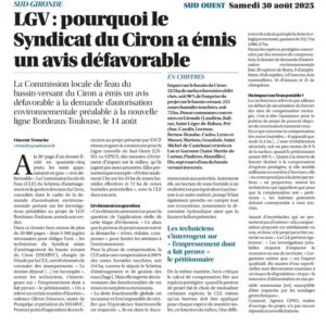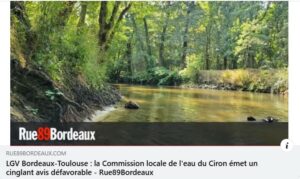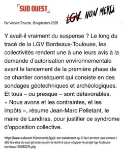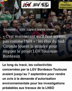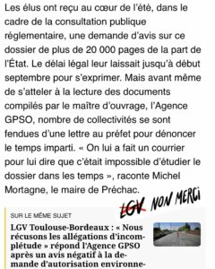 1 – l’indignation des communes consultées conformément à la Loi était à son comble cet été – 20 000 pages de dossier à lire et annoter pour un avis à rendre début septembre, sur le dossier environnemental des investigations préalables à la ligne Bordeaux/ Toulouse ! Autant vous dire que les avis défavorables sont nombreux, c’est une opposition quasi collective des communes…