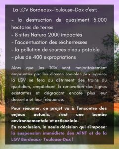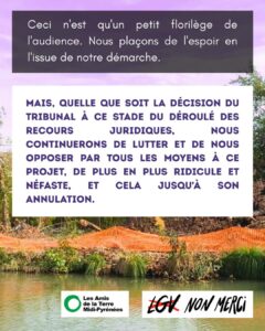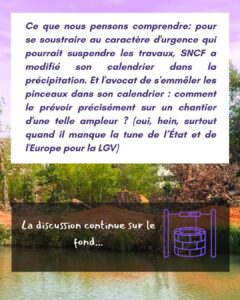 Voici un article de presse qui peut servir de compte-rendu succinct (quoiqu’inexact sur l’actualité du financement, il n’y a pas de financement de l’Etat/ celui de l’UE est non programmé) : « Une bombe environnementale et anti-sociale » : la justice va-t-elle suspendre le chantier le la LGV Toulouse-Bordeaux ? . Pas moins…Toutefois, selon les citations de cet article, nous constatons que SNCF réseau ne répond pas au Tribunal en tenant compte des remarques de l’avis défavorable du CNPN qui sert pourtant de base à ce recours…Les juges apprécieront. Jugement attendu sous huit jours pour savoir si les travaux sont stoppés en urgence, le fonds n’étant jugé qu’en fin d’année.