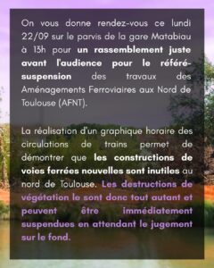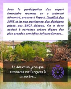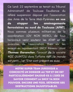 Ce 22/09/2025, le recours porté par Les amis de la Terre Midi-Pyrénées occupait le Tribunal de Toulouse: était examinée en référé – suspension sa demande de suspension des travaux pour la partie des AFNT (aménagements ferroviaires au nord de Toulouse). L’association saisissait la Justice en accéléré suite à la parution du Rapport explosif et essentiel du très officiel CNPN – Conseil National de Protection de la Nature – donnant un avis défavorable à SNCF réseau sur une demande de dérogation environnementale pour ses travaux détruisant des espèces animales et végétales protégées (explications dans notre article précédent).