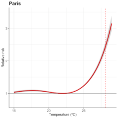 À Paris, par exemple, le risque de mortalité double pour une température de 3 °C supplémentaires par rapport à une température de confort de 22,5 °C, pour laquelle le risque est minime.