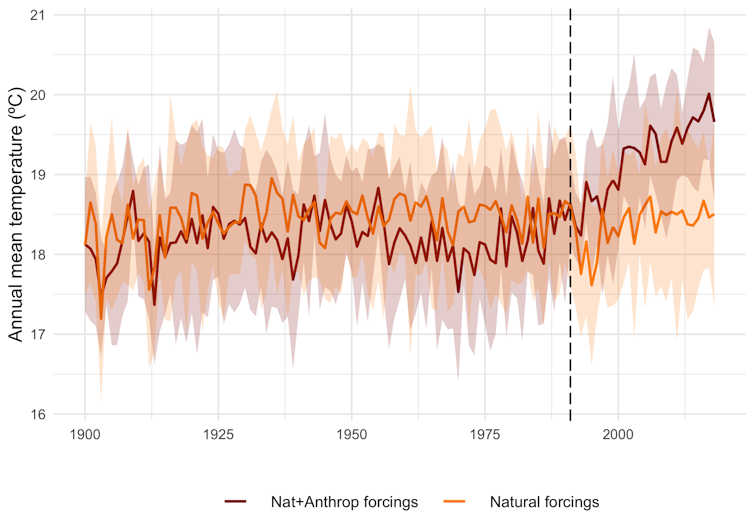 Ensuite, nous avons utilisé les dernières simulations de température disponibles (dans le cadre du projet d’intercomparaison des modèles de détection et d’attribution (DAMIP-CMIP6) pour deux scénarios climatiques :