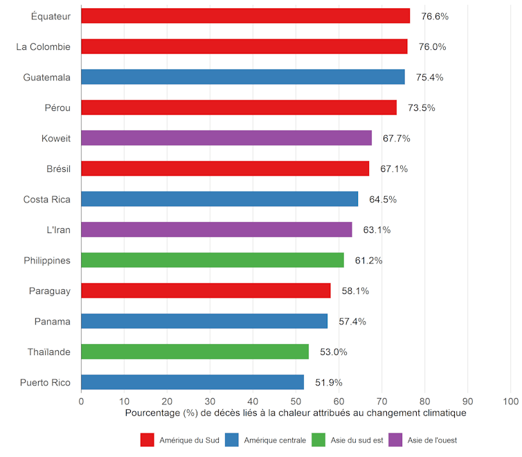 Les plus touchées, avec une proportion de mortalité liée à la chaleur due au changement climatique supérieure à 70 %, se situent dans les pays d’Amérique centrale et du Sud (l’Équateur avec 76,6 %, la Colombie avec 76 %, le Guatemala avec 75,4 %) et celles supérieures à 60 % en Asie du Sud-Est et de l’Ouest (le Koweït 67,7 %, l’Iran 63,1 %, les Philippines 61,2 %).