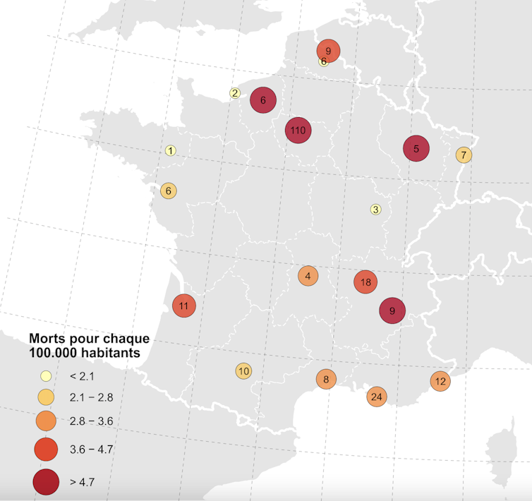 Nombre de décès (et taux de mortalité pour 100 000 habitants) dus à la chaleur attribuable au changement climatique d’origine humaine en France. Author provided