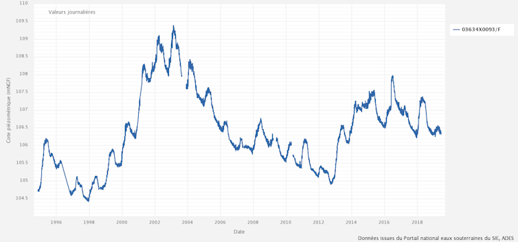 Évolution du niveau d’eau souterraine dans le forage [03634X0093/F] de Trainou (Loiret), interceptant la nappe des calcaires de Beauce. Cote piézométrique exprimée dans le référentiel géographique français, altitude au-dessus du niveau de la mer. BRGMCC BY-NC-ND